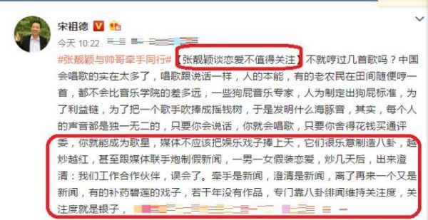 宋祖德先针对张靓颖的新恋情表示:“”张靓颖谈恋爱不值得关注。”