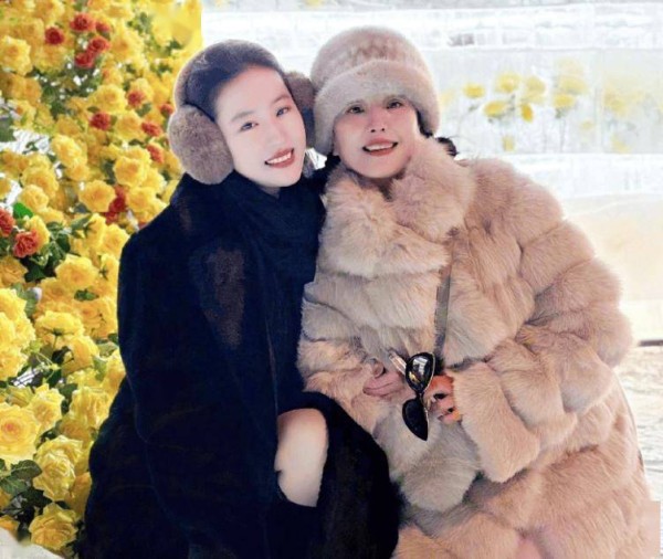 哈尔滨的冬日街头,刘亦菲穿着一身黑色皮草大衣,搭配过膝长靴,站在晶莹剔透的冰封黄玫瑰前嫣然一笑。她身旁,母亲刘晓莉身着浅咖啡色皮草,母女俩蹲坐在冰雕旁合影。
