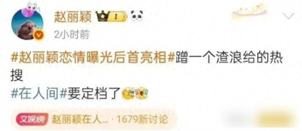 赵丽颖5月22号晚上在微博连发三条动态,第一条直接@了“赵丽颖恋情曝光后首次公开露面”这个热搜,说“蹭一个渣浪微博给的热搜”。第二条回复“赵丽颖这算官宣恋情吗”时回了句“算你妹”,第三条继续宣传新剧《在人间》定档。粉丝说她真性情,路人觉得明星不该爆粗口,央视凌晨发微博提醒公众人物注意说话方式。