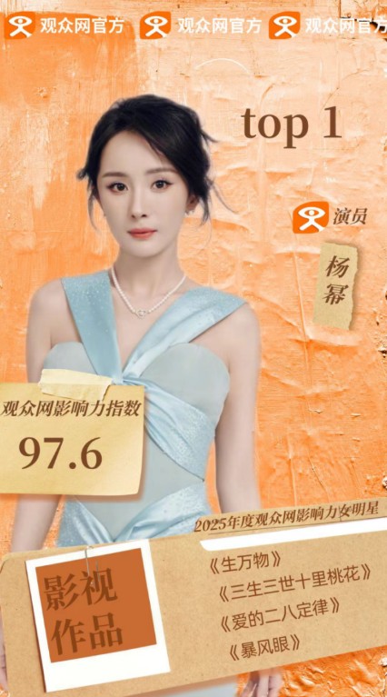 1. 杨幂:断层领跑,以“破圈者”姿态定义年度影响力。主演的都市剧《生万物》首播即破3亿播放量,其监制的女性题材短片集引发社会议题讨论;公益项目“乡村女性创业计划”覆盖超50个县域,商业价值与人文关怀双轨并行。