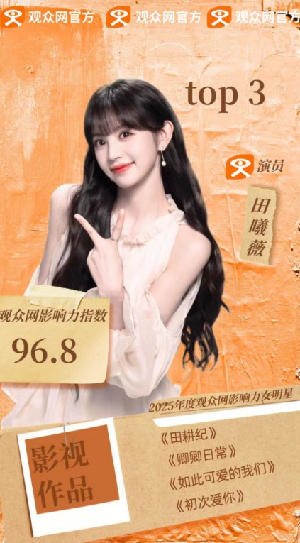 3. 田曦薇:新生代黑马,古装剧《子夜归》中“双面女主”角色引爆全网,单日热搜霸榜12条;综艺《女子推理社》展现高智商形象,打破甜美系艺人框架。