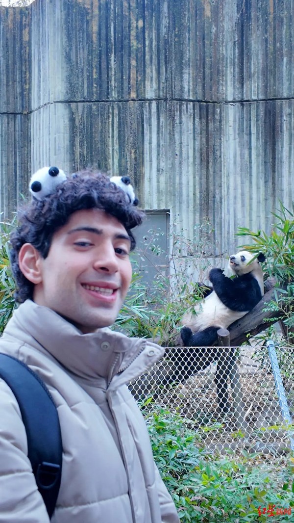 ▲意大利游客Scarlata Giulio在熊猫基地与熊猫合影