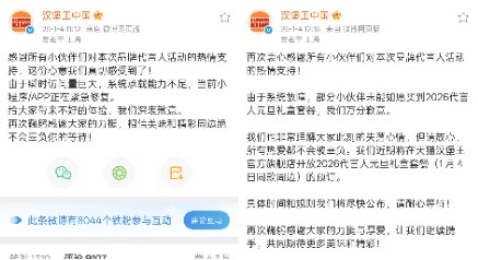 而在第二条致歉中,官方称“由于系统故障,部分小伙伴未能如愿买到2026代言人元旦礼盒套餐,我们万分歉意。我们也非常理解大家此刻的失落心情,但请放心,所有热爱都不会被辜负。我们近期将在天猫汉堡王官方旗舰店开放2026代言人元旦礼盒套餐(1月4日同款周边)的预订。”