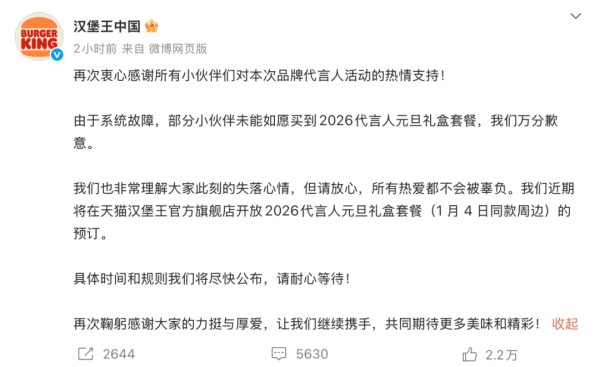 约一个小时后,汉堡王中国再次发文致歉:“由于系统故障,部分小伙伴未能如愿买到2026代言人元旦礼盒套餐,我们万分歉意。我们也非常理解大家此刻的失落心情,但请放心,所有热爱都不会被辜负。我们近期将在天猫汉堡王官方旗舰店开放2026代言人元旦礼盒套餐(1月4日同款周边)的预订。具体时间和规则我们将尽快公布。”