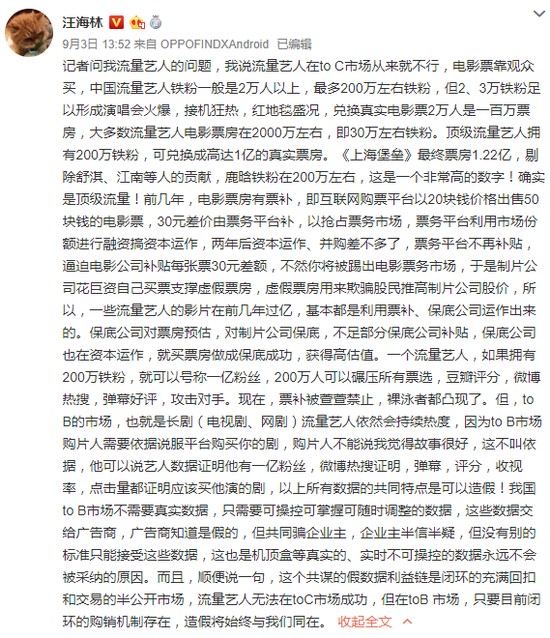 知名編劇揭流量造假:票補取消後流量明星現原形编剧汪海林怼流量明星什么情况?编剧汪海林怼流量明星原因