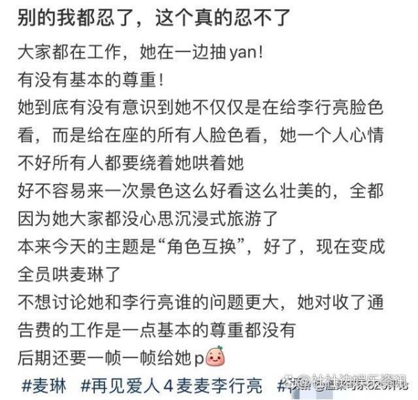 话题标签:#麦琳抽烟事件 #公众人物形象 #娱乐圈监督