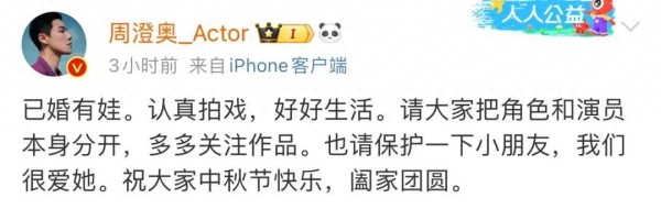 9月15日这一天,演员周澄奥突然在个人社交平台上公布,自己已经已婚有娃,以后再工作上做一个好演员,在家庭里担起责任,做一个好爸爸。作为90后的小鲜肉,干什么事情当真是快,最后他祝福大家中秋节快乐。