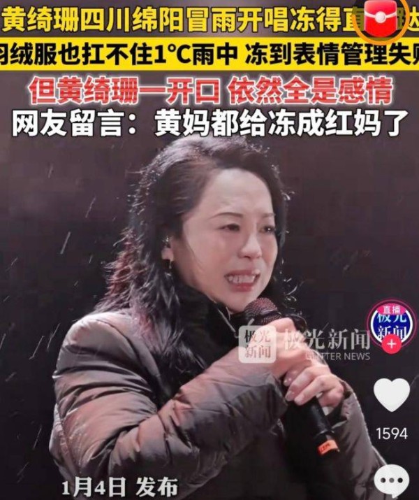 1月4日,关于歌手黄绮珊在四川绵阳冒雨演唱的消息迅速引起了广泛关注。根据媒体报道的画面,黄绮珊穿着羽绒服在雨中尽情演唱,尽管雨水将她的羽绒服完全打湿,她依然毫不畏惧,继续在台上演绎自己的歌曲。然而,冷雨让她不时跳动着取暖,表情也有些失控。这样的场面让人看了既感到心疼,也觉得有些好笑,瞬间引发了人们的讨论。