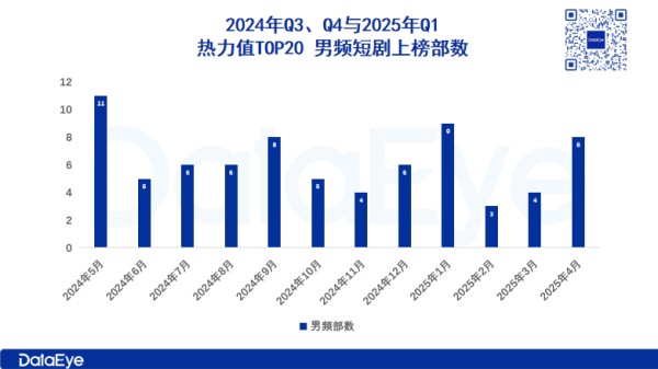 DataEye数据显示,2024年第三季度至2025年4月,在国内微短剧热力值TOP20榜单中,男频题材共上榜52部,占比26%,男频短剧的产量也从521部持续回落至目前的312部,市场持续低迷。