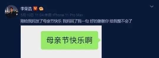 过节日的时候,李荣浩也是很主动的向妈妈说了一声祝福,但被妈妈回复的方式给直接憋回想要再说的话。对于这事,李荣浩还把它发到网上跟大伙分享,自己还郁闷了一番。