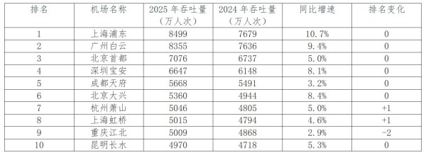 民航联盟2026年01月04日消息: 据CADAS数据,2025年中国境内机场旅客吞吐量达到15.29亿人次,不仅全面恢复并超过2019年水平,也标志着中国航空市场进入“量稳、结构分化加速”的新阶段。上海浦东、广州白云、北京首都三大机场继续领跑,揭阳潮汕机场以18.0%的增速首次跻身千万级机场行列,而十堰、奇台等中小机场则实现了跨越式增长。本报告旨在分析2025年全国机场运营的整体态势、区域格局变化及未来发展趋势。