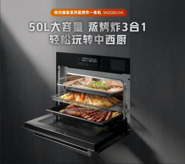 还有林内大道系列蒸烤炸一体机SKZQ50-DG,50L大容量蒸烤炸3合一,3种独特蒸法、7+1多维立体烤模式,还有35道精心编排的自动菜谱,0油空气炸无需额外添油,有效减少油脂摄入更健康,还支持24小时预约功能,每天醒来都能吃上新鲜美味美食。林内厨电通过创新科技与人性化设计,为消费者打造更健康、便捷、高效的生活方式。