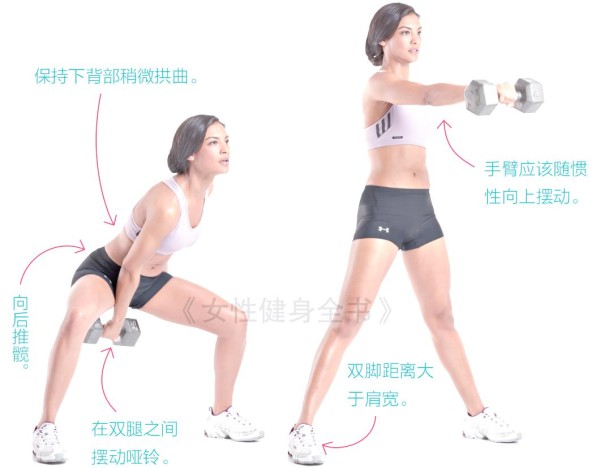 单手正握哑铃,将手臂垂下,使哑铃位于腰前,或者选择双手握住哑铃进行练习。接着,弯曲髋关节和膝盖,身体前倾,直至躯干与地面形成45度角。在此姿势下,双腿间摆动哑铃。保持双手臂伸直,挺起髋部,同时伸直膝盖,站直时将哑铃摆动至胸部齐平的位置。重复蹲下动作,再次在双腿间摆动哑铃,并用力进行来回甩摆。