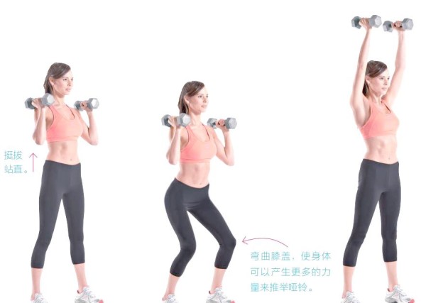 首先,将哑铃举至肩膀旁边,肘部微微弯曲。接着,双膝下沉,积蓄力量。然后,双腿同时爆发,用力向上推举,同时将哑铃直臂举过头顶,以提高推力与全身协调。