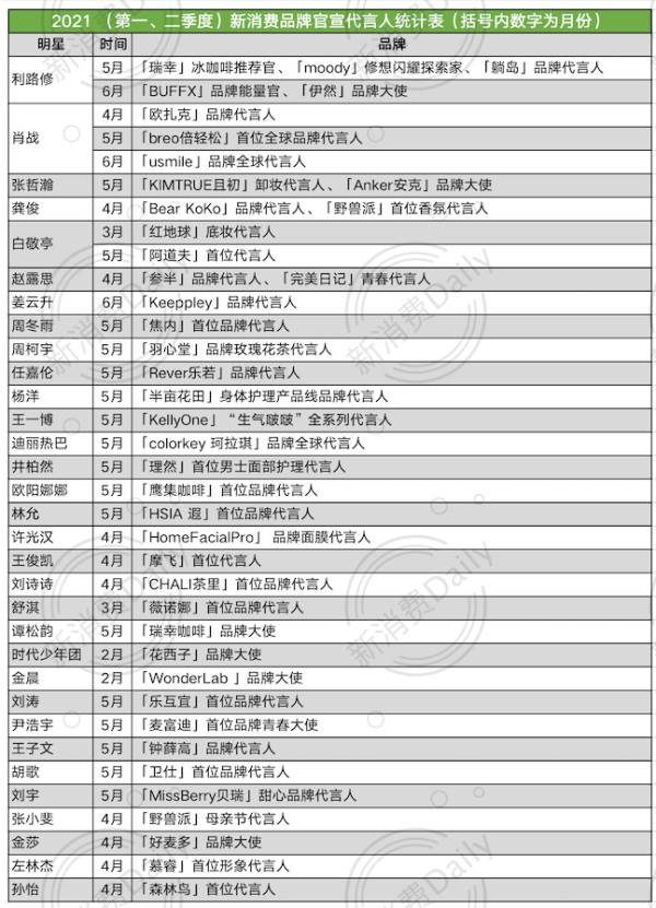事实上,不仅仅是利路修一人,从某种程度上“利路修现象”也验证了一个趋势,即新消费品牌开始找代言人了。据新消费Daily不完全统计,在2021第一、二季度共有41个新消费品牌与33位明星艺人开展代言合作。其中代言人官宣的爆发期集中在第二季度,且包括倍轻松、理然、焦内在内的15个新消费品牌都是首次官宣代言人。
