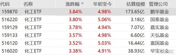 化工ETF、化工龙头ETF、化工ETF嘉实、化工ETF天弘、化工50ETF涨超3%。
