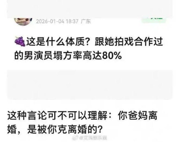 这次,杨紫成为了躺着中枪的受害者。有个黑粉在论坛上发帖,标题直截了当地问:杨紫究竟是什么玄学体质?合作过的男演员塌房率竟高达80%。帖子里列出了她所谓的战绩:她和邓伦合作拍《香蜜沉沉烬如霜》,结果邓伦因为偷税漏税被除名,剧集也被下架;她和吴亦凡一起拍《青簪行》,结果吴亦凡因为犯罪入狱,剧组不得不重拍,更换演员,成本大幅上升;甚至连在《家有儿女》里饰演父亲的高亚麟,去年也爆出了家暴和出轨丑闻,连带着整个作品都面临下架风险。