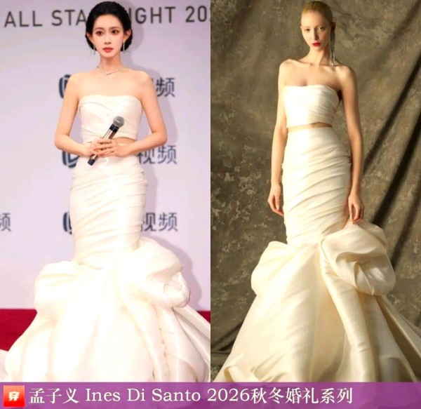 孟子义在2025星光大赏上,身着一套白色缎面分体式鱼尾礼服,该款式源自Ines Di Santo的2026秋冬婚礼系列。Ines Di Santo,这个加拿大品牌,以其别具一格的设计和精湛的工艺,在时尚界独树一帜。