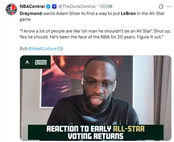 谈到詹姆斯在全明星球迷首期投票中排名西部第9,追梦表示:这是20多年来我们第一次看到的情况,这将使他很难成为首发,然后你可能会问,教练们会把他选为替补吗?我不知道,他只打了14场比赛,我不知道他们如何看待这件事,或者他们会怎么做。但我知道的是,他们最好确保他进入全明星,这可是勒布朗·詹姆斯!