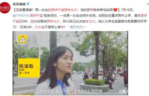 小姑娘叫陈淑盈,从小学五六年级就开始喜欢易烊千玺,看到爱豆在《天天向上》中说想读北京大学,就立志要考北京大学,后来,易烊千玺去了北京电影学院,小姑娘就说:"你的梦想,我来帮你实现,我觉得追星是有资本的,好好学习才有能站到偶像面前"。