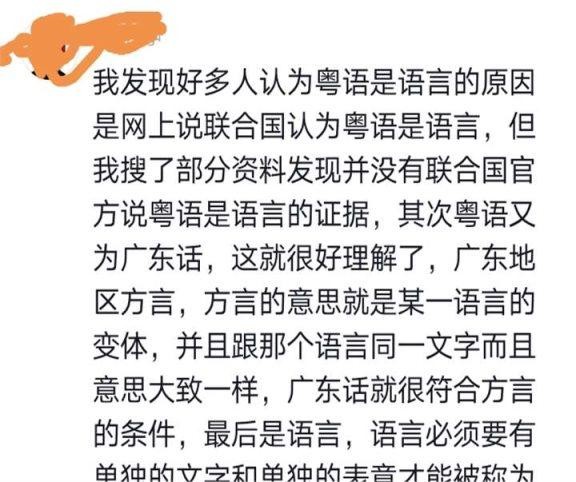 一位湖北网友批评道:“我发现很多人认为粤语是语言的原因是网上声称联合国认定粤语为语言,但我查阅了一些资料后并未找到联合国官方确认粤语为语言的证据。此外,粤语又称为广东话,这很容易理解,即广东地区的方言。方言指的是某一语言的变体,与该语言使用相同的文字,且含义大致相同。广东话正好符合成为方言的条件。最后,从语言的角度来看,必须具备独立的文字系统和表意功能才能被称为语言,然而粤语却不具备这些条件。”