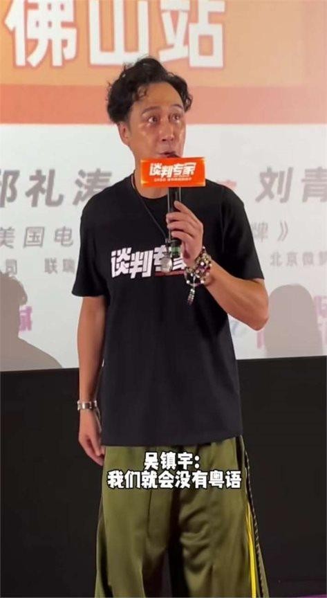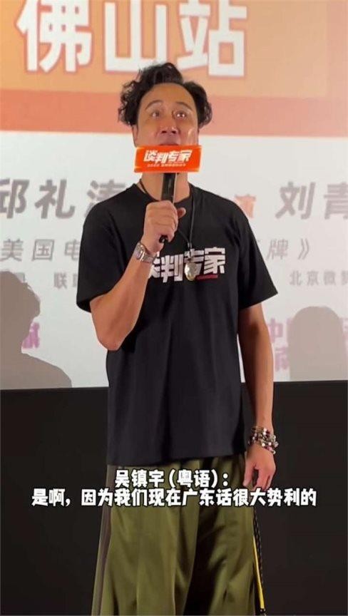 吴镇宇于6月3日随《谈判专家》剧组前往广东佛山参加路演,其间他的一番言论引起了热议并登上了热搜。他意味深长地说:“希望你们能够支持我们的广东话版本,否则它就真的要灭绝了。其实我们的广东话是非常有影响力的,它是联合国六种工作语言之一。设想一下,还有日本、韩国、普通话、英语,真的需要你们支持讲广东话的演员,否则情况就真的相当糟糕了。”