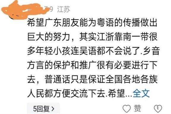 当然,也有许多外地网友支持粤语,一位江苏网友表示支持:“希望广东的朋友能为粤语的传播做出巨大的努力。实际上,包括江浙南部在内的许多年轻一代和儿童已经不会说吴语,因此乡音方言的保护和推广显得尤为重要。普通话仅是为了确保全国各地各族人民能够便利地进行交流。希望各地学校继续推进双语教学,同时发展普通话和方言。”