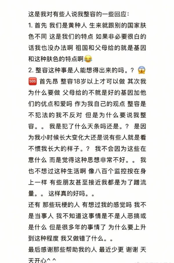 搜狐娱乐讯 近日,甜馨在社交平台再度发长文回应整容猜测,“为什么要说我整容,我是犯了什么天条吗?父母给的不就是他们好的基因加他们的优点和爱吗?”“是因为我长大变化大还是说有些人就是看不惯我长大的样子。”