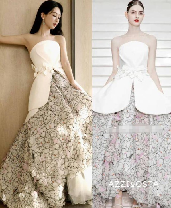 被模特上身的礼服,中间腰部,分叉的部分距离很近,而被杨紫上身的礼服,露出的花瓣面积则大出很多。