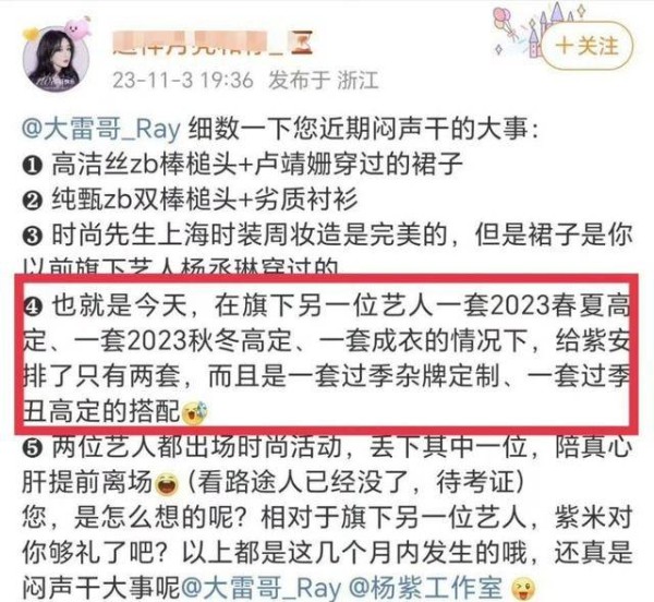 有杨紫粉丝在网上为杨紫“鸣不平”,直指杨紫此次红毯不但穿过季高定,而且还列出几次杨紫穿其她女明星穿过的礼服。