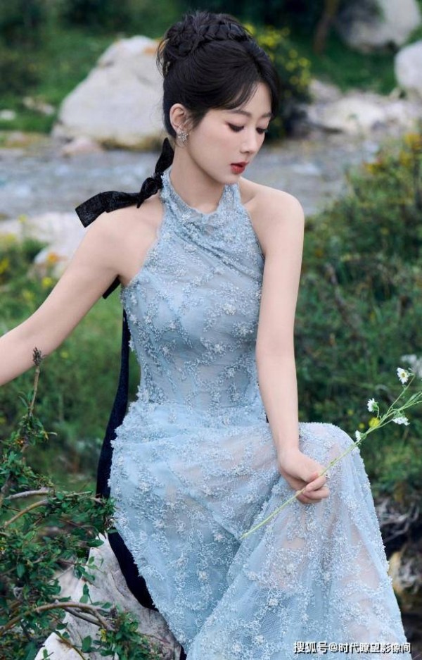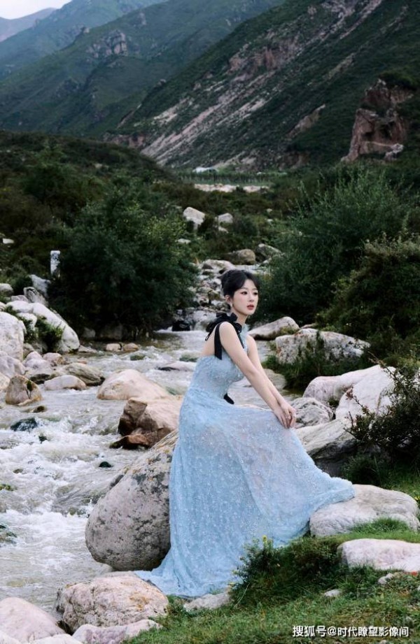 当杨紫置身于山野之间,身着一袭淡蓝色礼裙,那画面宛如一幅绝美的油画。轻柔的面料恰似山间缥缈的薄雾,灵动飘逸;裙上精致细腻的花纹,仿若从葱郁草地与潺潺溪流中精心撷取的生机,栩栩如生。她与周围的绿意盎然、溪流潺潺、石块嶙峋完美相融,毫无违和感,仿佛她本就是这山野孕育出的精灵,带着与生俱来的活力,将自身与自然的生命力紧紧缠绕,演绎出一场人与自然和谐共生的时尚传奇。这并非简单的场景融合,而是杨紫对时尚与生命力独特理解的具象化呈现,她让时尚摆脱了 T 台的束缚,走进了广袤的自然天地,赋予时尚以鲜活的呼吸。