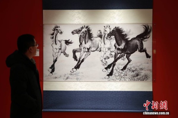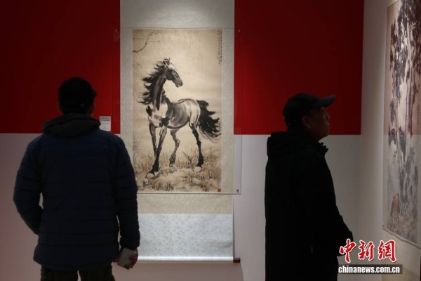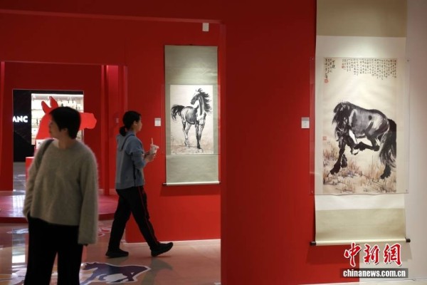1月8日,市民在北京金融街购物中心观看“春风得意马蹄疾——2026年徐悲鸿艺术展”,展览集中展出了徐悲鸿先生的30余幅佳作。中新社记者 王紫儒 摄