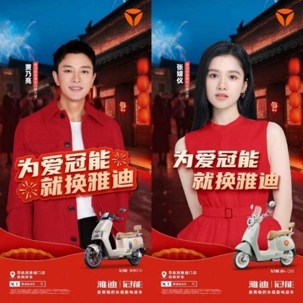 而作为新国货代表,雅迪也荣获《人民日报》力赞。更是在央视发布的新年贺岁大片《老马的车》中 C 位出镜,获得贾乃亮、张婧仪、吴艳妮、徐梦桃、王心迪等众多明星和中国邮政、优酷等名企的点赞。