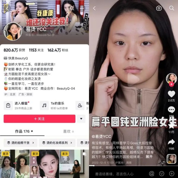 如美妆博主易烫YCC在某一期视频中运用到Goss大叔的“捏骨修容”化妆手法,但针对亚洲女性面部的扁平圆钝特点做了相对的改良进行妆教,另外,易烫的美妆内容还经常提到亚洲女性专属的“方圆脸”的化妆思路。