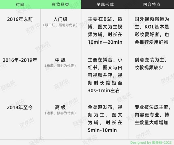 古早时期主要是视频搬运,时长在10min-20min左右,但时代发展改变了消费者的平台使用习惯,有一部分国内美妆爱好者开始自主发布相关图文与视频,内容较为基础与粗糙,初期国内美妆KOL是作为“好物分享/推荐官”的角色出现。