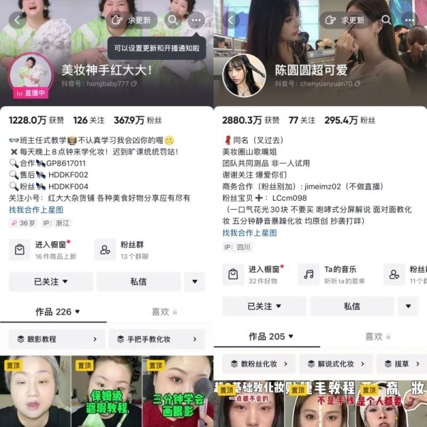 如专业化妆师兼美妆KOL“美妆神手红大大”,在其内容中展示的是简单易学且粗暴的化妆手法,但却有惊人的效果,自称“班主任式教学”,而博主“陈圆圆超可爱”则是通过与粉丝或想学化妆的消费者,以微信视频指导的方式进行妆教,时而以山歌的方式表达其中的喜怒哀乐,二者的妆教方式与个人性格都非常鲜明。