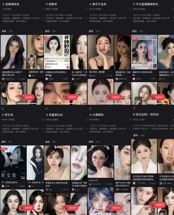 在小红书平台搜索“妆容”,便可以看到2022年度的红妆大赏,其中提到了小红书的年度十大妆容,包括“亚裔辣妹妆”、“纯野妆”、“斩女妆”等等,妆容风格层出不穷,热度不减。