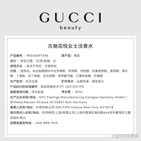 该香水采用变性乙醇作为溶剂基础,配合水与日用香精调配而成,属于典型的淡香水(Eau de Toilette)结构。成分表中包含芳樟醇、苯甲醇、香茅醇等多种天然香料衍生成分,这些都是国际通用的香精原料,符合国家进口化妆品备案标准。值得注意的是,由于含有酒精及部分香料成分,本品易燃,需远离明火与高温环境存放。生产信息明确标注于包装,执行标准编号为国妆网备进字(沪)2021501195,由德国企业HFC Prestige Manufacturing Cologne Germany GmbH生产,境内责任人则为科蒂商贸(上海)有限公司,服务热线400-898-1919可随时咨询售后问题,保障消费者的合法权益。