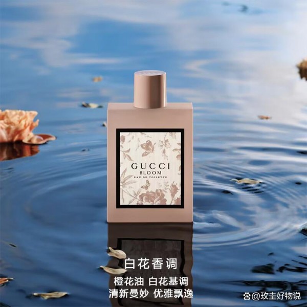 香水瓶身设计延续了Gucci一贯的简约风格,透明玻璃材质搭配简洁线条,顶部黑色盖帽与金色品牌标识形成对比,整体看起来干净利落。特别值得一提的是,官方描述中提到“置于水面之上,周围点缀着几片花瓣”,这一画面感极强的设定,并非指实际使用方式,而是用于传达香水所营造的情绪氛围——宁静、浪漫、富有诗意。这也正是这款香氛想要传递的核心情绪:不是张扬夺目,而是温柔地存在于你的一呼一吸之间。