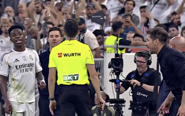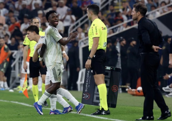 上半场,当皇马1-0领先后,西蒙尼在场边故意找维尼修斯麻烦。当维尼修斯在边线活动时,西蒙尼立刻对着他喊道:“弗洛伦蒂诺迟早会把你卖掉,你就等着吧。”不过,维尼修斯没有上当,继续比赛。
