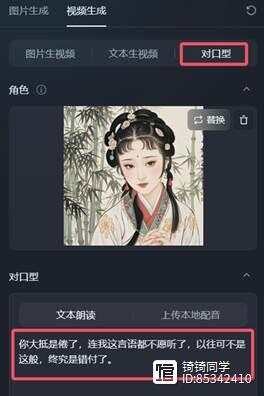 拿即梦举例:选择对口型-导入图片(会自动识别角色)-复制文案-选择朗读音色-生成视频。