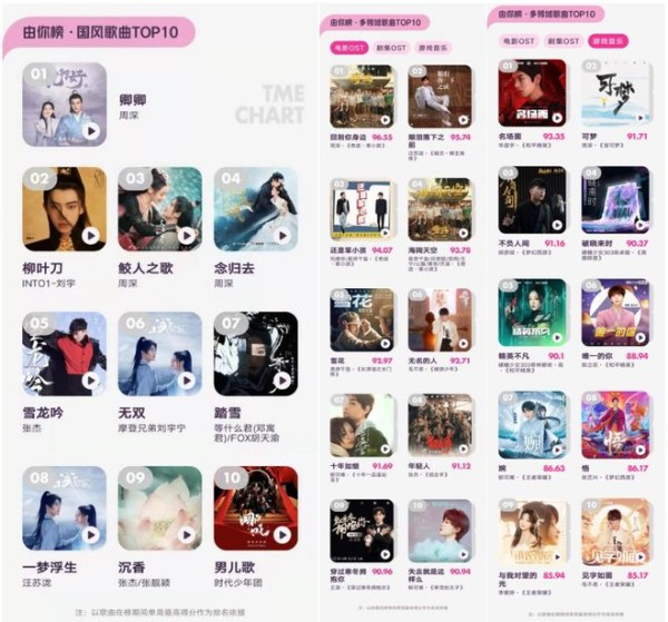 此外,音乐风格多样化的00后歌手们在不同领域的成绩都可圈可点。王源曾多次为电影主题曲献唱,其演唱的电影《穿过寒冬拥抱你》同名OST位列本次年中盘点电影OST榜单第九名。同样是00后歌手的陈立农,为手游和平精英演唱推广曲《唯一的你》也进入上半年度由你榜游戏音乐前十。音乐向电影、游戏等领域的辐射,不仅让更多好的音乐作品借力“出圈”,也通过歌手自身的热度,吸引更多听众去尝试接触和了解不同类型的音乐。