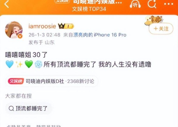 这事情闹确实有点收不住。司晓迪整了一出“炸弹”,直接甩出16个男艺人的私密关系话题,网红与顶流这样杠上,谁领风骚咱也说不好。这些顶流里面像鹿晗、范丞丞这些名字家喻户晓,她这么一说,评论区都炸锅了。问该信谁呢?爆料这事儿,你琢磨吧。