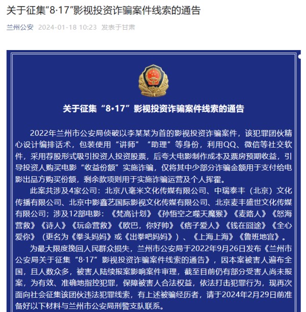 1月16日,兰州市人民检察院、兰州市公安局联合发布通告,征集一起影视投资诈骗案件线索。兰州警方披露称,涉案犯罪团伙精心设计编排话术,引导投资人购买电影“收益份额”实施诈骗。