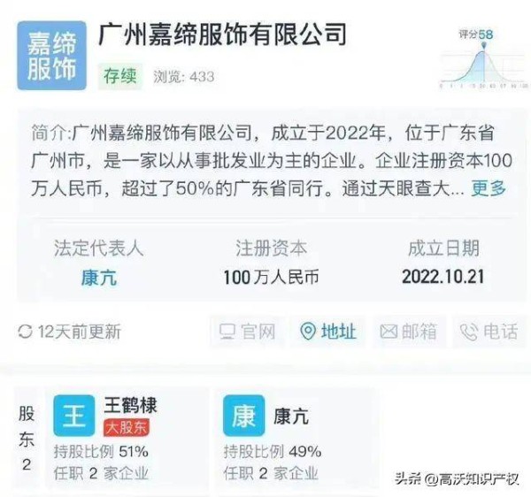 据天眼查App显示,近期,广州缔造品牌管理有限公司、广州嘉缔服饰有限公司成立,法定代表人为康亢,注册资本均为100万网民币。股东信息显示,两公司均由王鹤棣、康亢共同持股,其中王鹤棣持股51%。