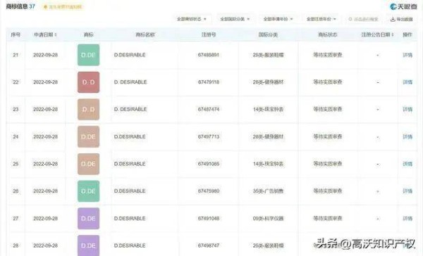 截至目前,广州缔造品牌管理有限公司已申请30余枚“D.DESIRABLE”“D.DETAIL”文字、图片商标,国际分类包括服装鞋帽、策划销售、珠宝钟表等,当前商标状态多为申请中。