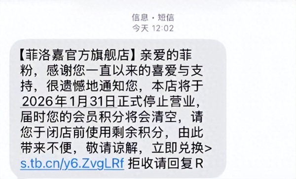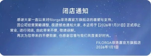 1月1日,菲洛嘉Filorga天猫官方旗舰店发布公告称,将于2026年1月31日正式停止营业,原因是公司经营策略调整。