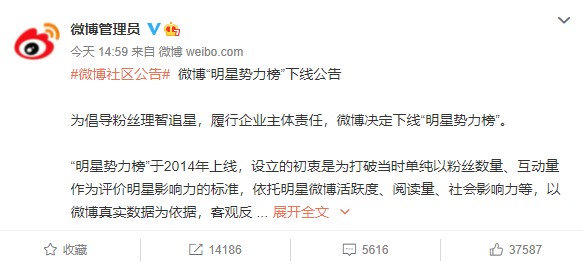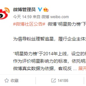 由于最近一年来部分明星粉丝群体非理性应援、刷榜等问题愈演愈烈,对明星势力榜评分机制形成挑战,榜单不能全面客观地反映明星的社会影响力,也与健康的星粉互动生态产生偏离,微博决定将“明星势力榜”下线,进行多维度改造升级。