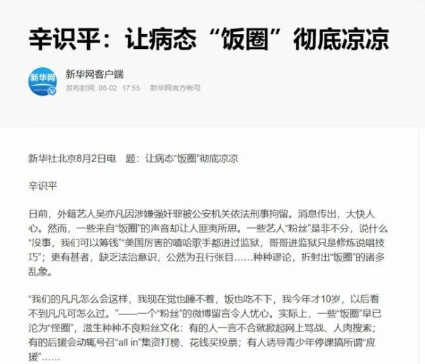 一场有关治理不良粉丝文化的行动早已开始。8月2日,新华社还发表了一篇署名辛识平的文章《让病态“饭圈”彻底凉凉》。