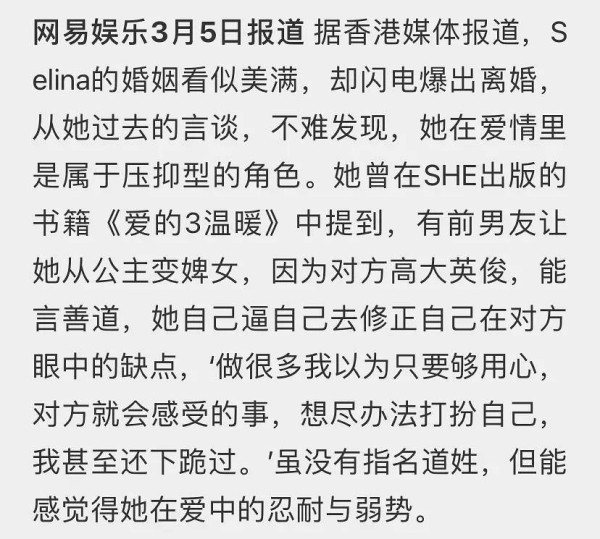 selina看男人眼光一直不行,以前综艺采访SHE男人外面乱搞回家你第一时间是做什么,selina居然答当然是先洗干净了,hebe和ella两个人都有点傻眼,然后帮她圆一下,弄下综艺效果就过去了……也有人说selina爸爸对她很严,这样容易遇事自我反省,然后讨好严格的一方。有时想想女孩子照顾别人情绪自己却活得好累。